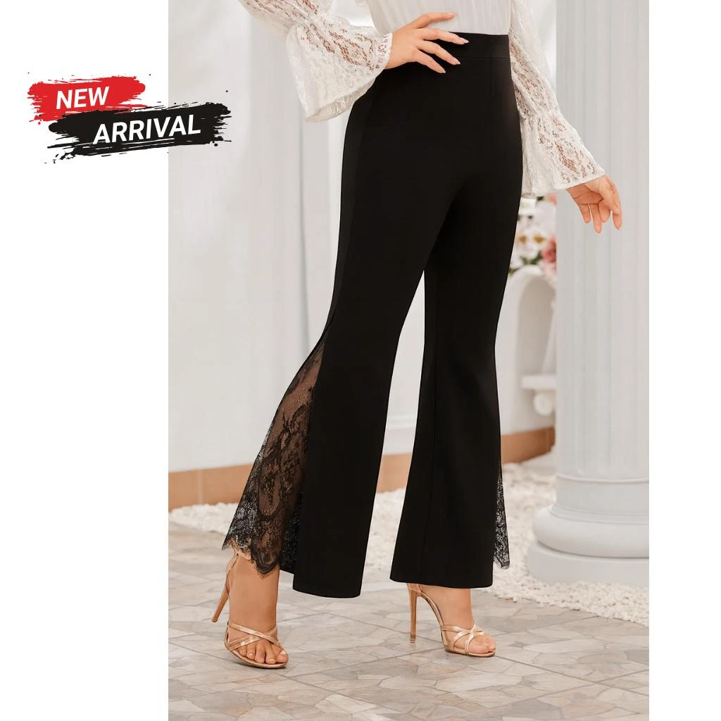 Elevate your look with these chic black high-waist pants. Designed with a sleek slim fit and subtle flared hem, they feature elegant sheer lace side panels that add a touch of sophistication and femininity. Perfect for evening outings, formal occasions, or stylish everyday wear. Pair with heels and a dressy top for a polished finish.