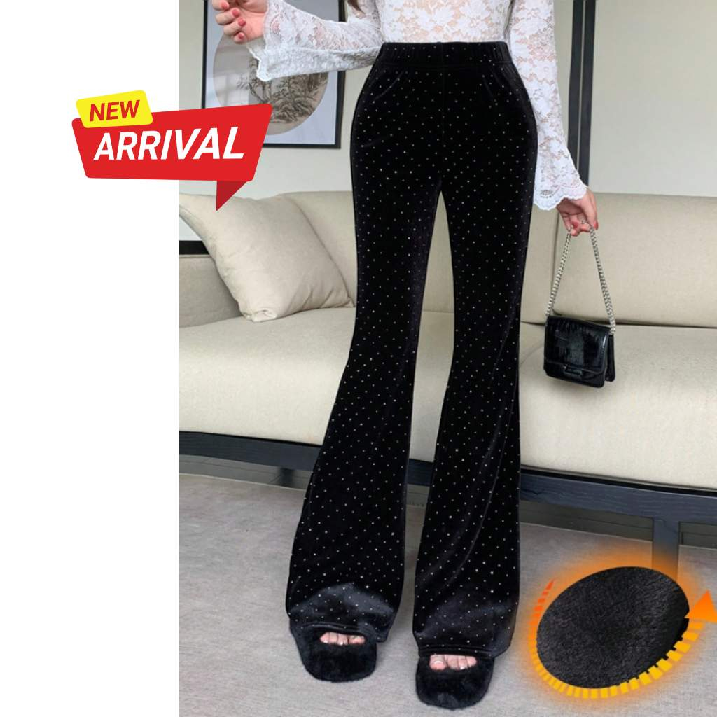 بنطلون قطيفة ليكرا شارلستون فخم مزين بفصوص لامعة، بكمر استك عريض لراحة وأناقة أكتر. مناسب للسهرات، المناسبات، والخروجات المميزة. متاح باللون الأسود فقط، بمقاسات من 40 لحد 130 كيلو، ومعاينة قبل الاستلام متوفرة.