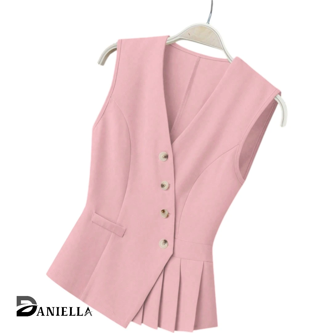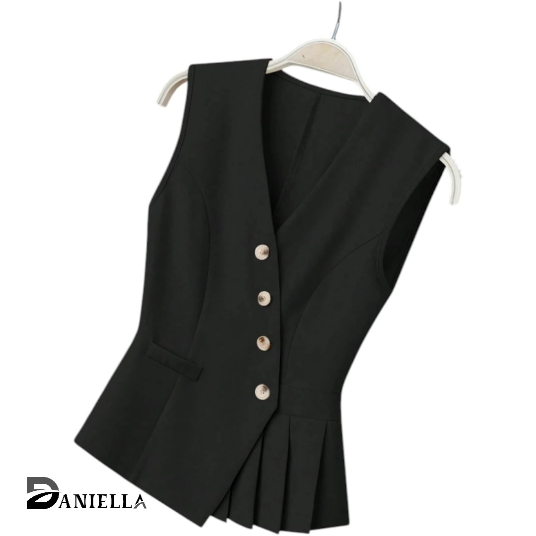 A refined sleeveless waistcoat featuring a flattering V-neckline, structured fit, clean front buttons, and elegant pleated detailing at the hem. Designed to elevate both casual and formal looks with a polished, feminine finish.