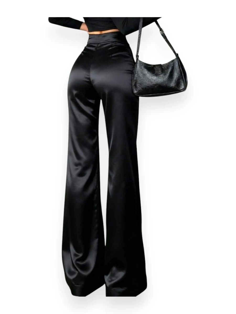✨ Elegant Black Satin Pants – بنطلون ستان أسود بتصميم واسع أنيق وخصر عالي يعطي مظهر طويل وانسيابي.