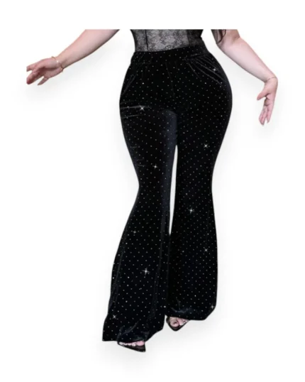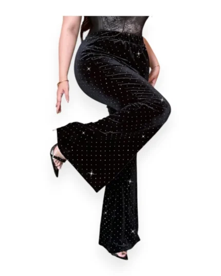 بنطلون ترتر أسود بتصميم Flare وقصة Slim تبرز القوام، مصنوع من خامة مطاطة مريحة بلمعة فاخرة، مثالي للسهرات والحفلات والمناسبات المسائية. A black sequin flare pants with a slim fit and stretchy fabric, offering a glamorous shine and elegant look—perfect for parties and evening occasions.Black Sequin Strapless Top