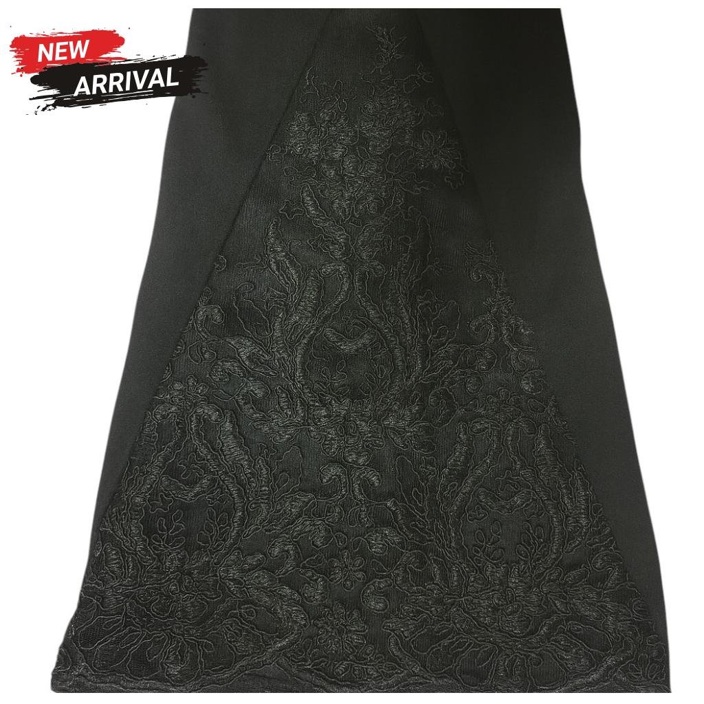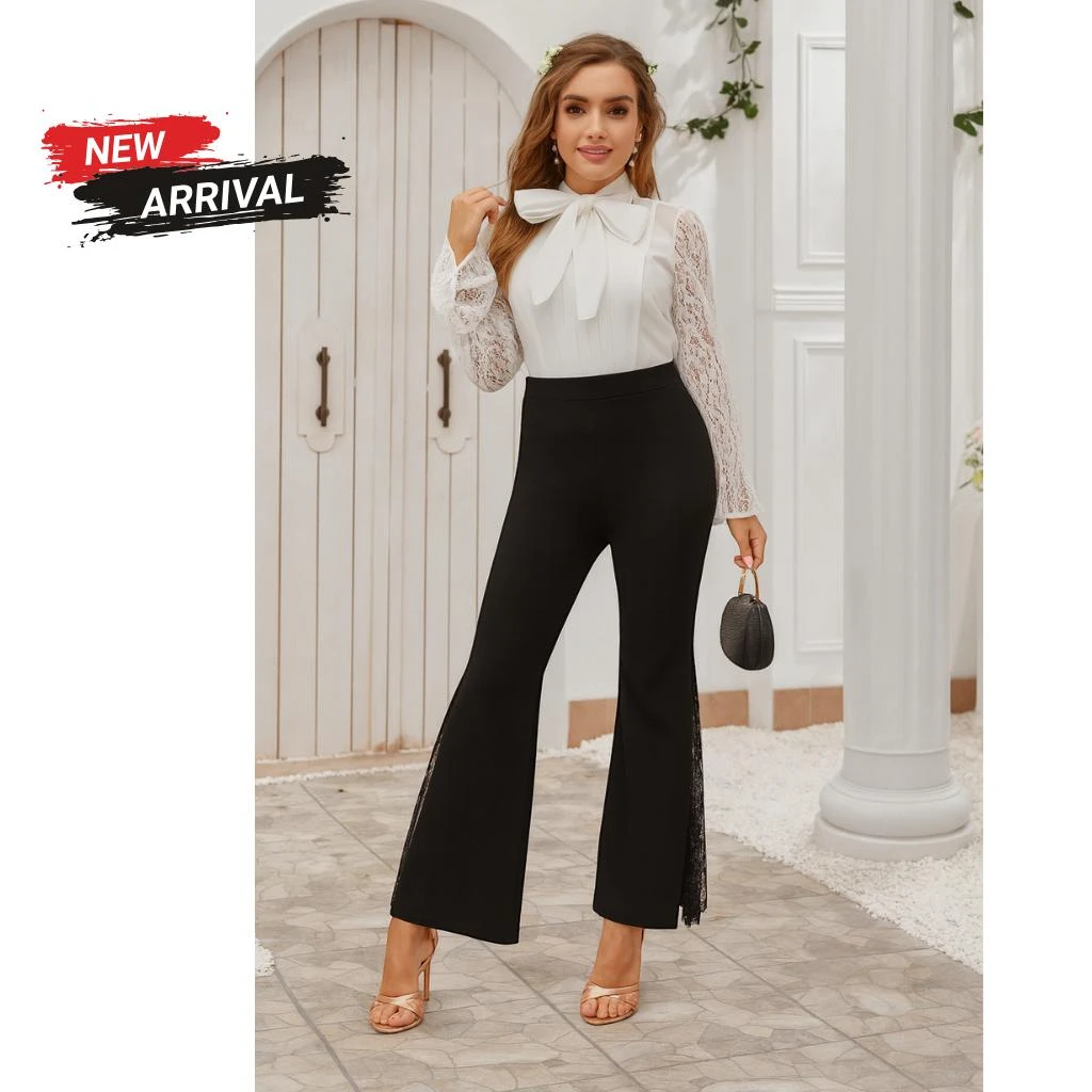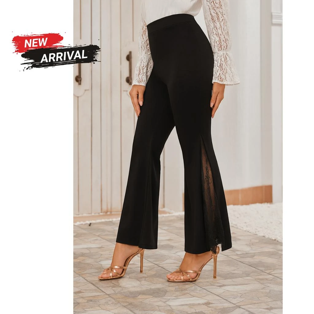These elegant black high-waist pants are crafted from premium Crepe Scuba Lycra, combining comfort, stretch, and a sleek silhouette. The design hugs the waist and hips with a slim fit, then subtly flares towards the hem for a graceful look. A unique highlight of this piece is the sheer floral lace panels running along the sides from mid-thigh to ankle, creating a refined balance between modest coverage and fashionable detailing. The lace adds sophistication, making these pants versatile for both evening occasions and chic daytime styling.