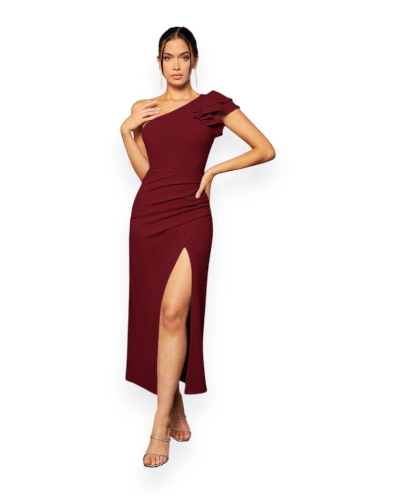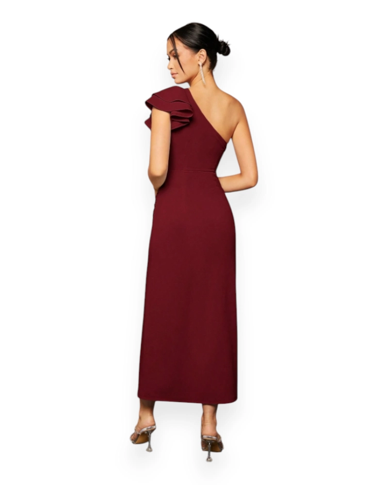 Elegant One-Shoulder Slit Evening Dress (Burgundy)