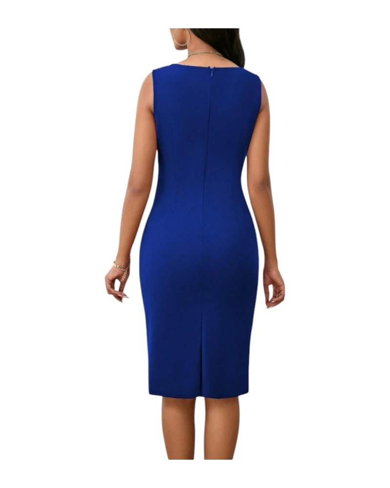 An elegant sleeveless midi dress designed with a slim fit silhouette and soft ruched detailing at the waist, creating a flattering and feminine look with timeless elegance.