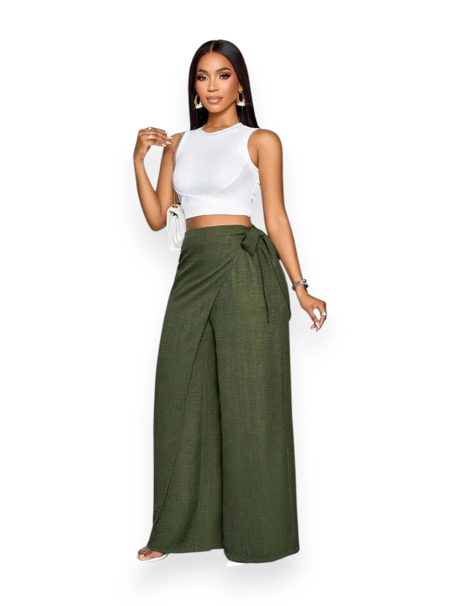 بنطلون بالازو واسع بتصميم Wrap Style يلتف حول الجسم مع ربطة جانبية أنيقة تضيف لمسة أنثوية مميزة.